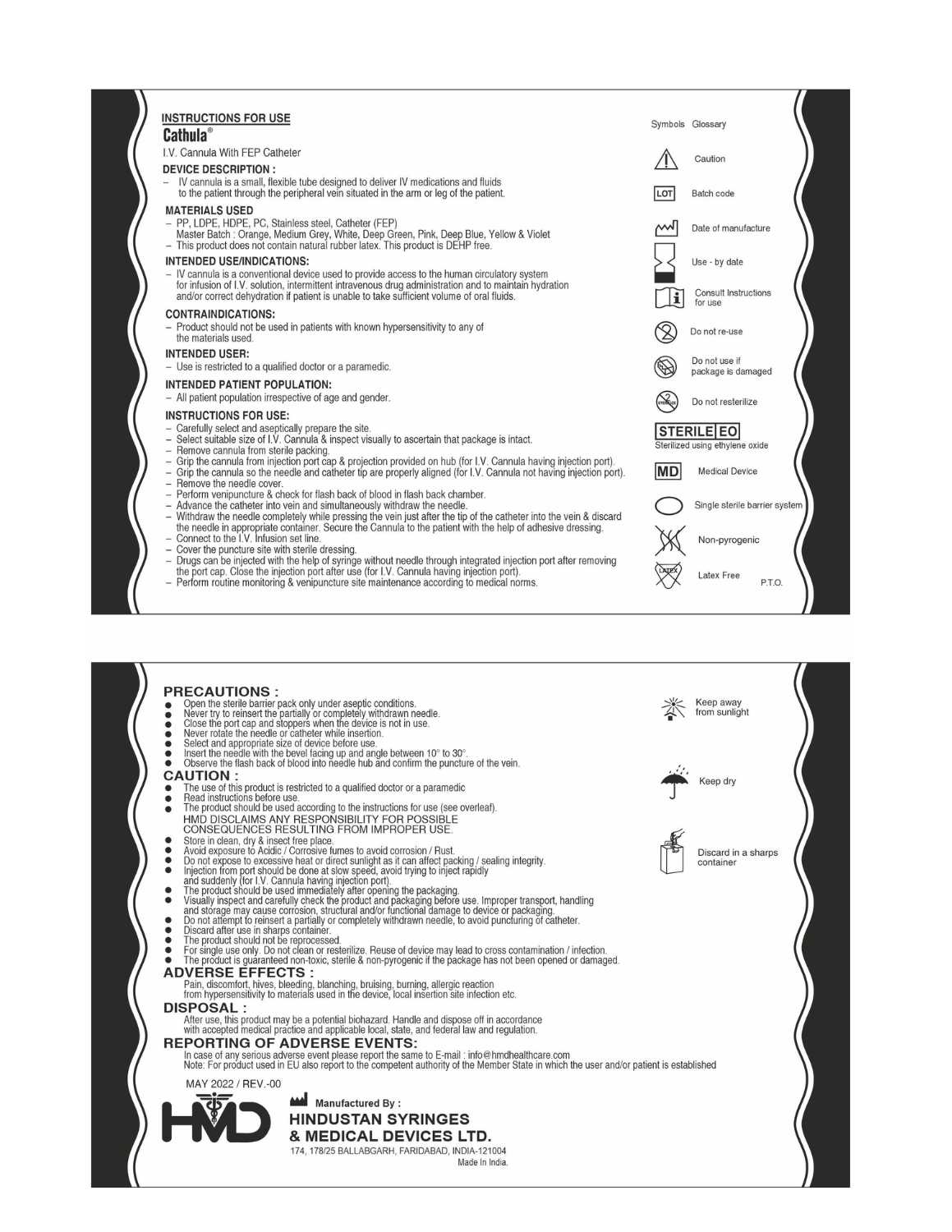 HMDs Cathula I.V. Cannula has Wings that are made up of nontoxic, medical-grade polypropylene compatible with any medication. The injection port and the receiving end of the wing have a 6% luer taper as per ISO:80369.The Needle is made from cold-rolled stainless steel strips. The tip of the needle has a short bevel ‘back’ cut point for easy catheterization and minimal pain and risk of perforation.